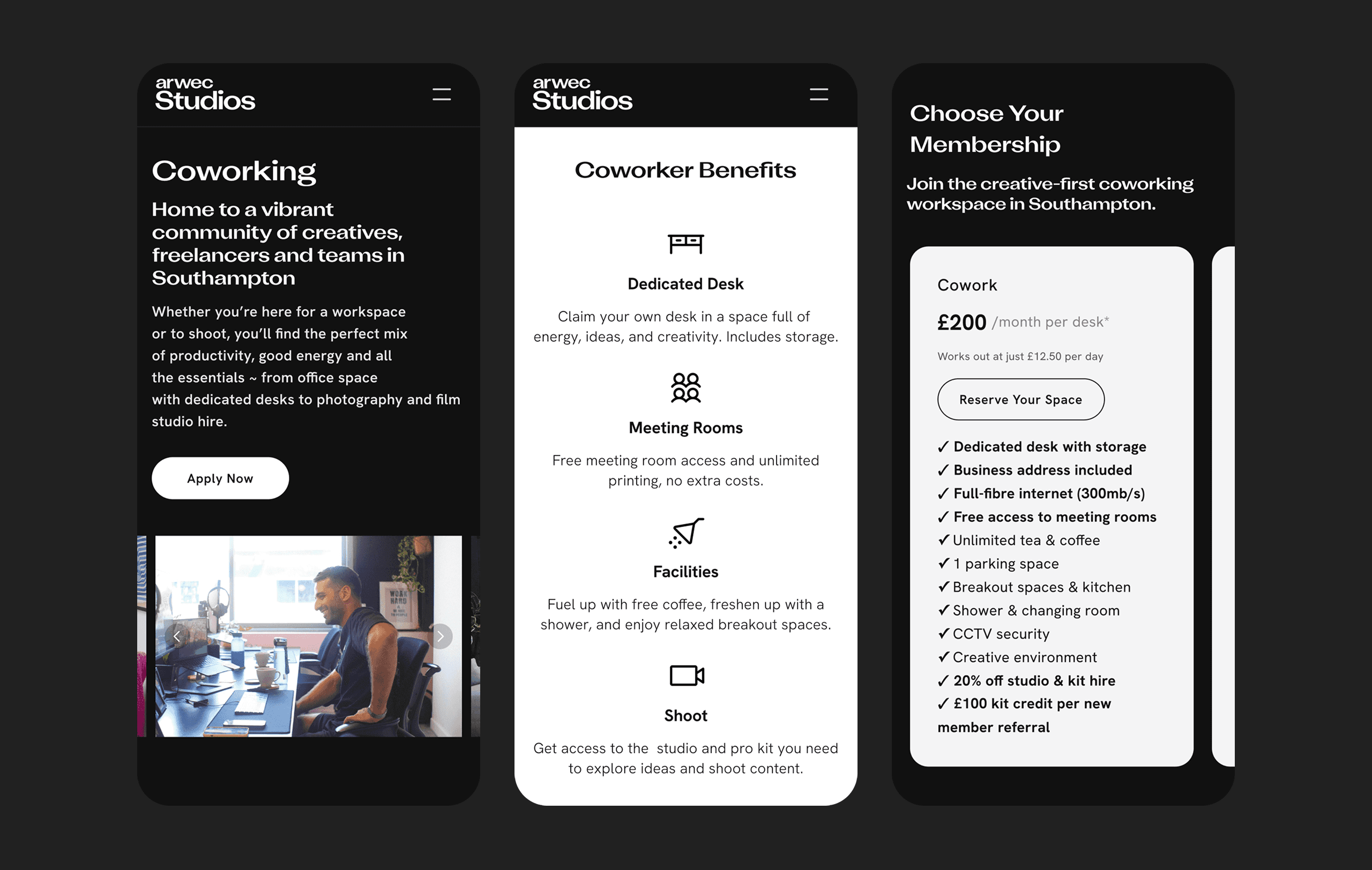 Working directly with the Arwec Studios founder, I designed and built a website for them in Framer. The design strategy centered on bold visual storytelling, clear information architecture, and seamless conversion pathways for prospective clients and coworking members.