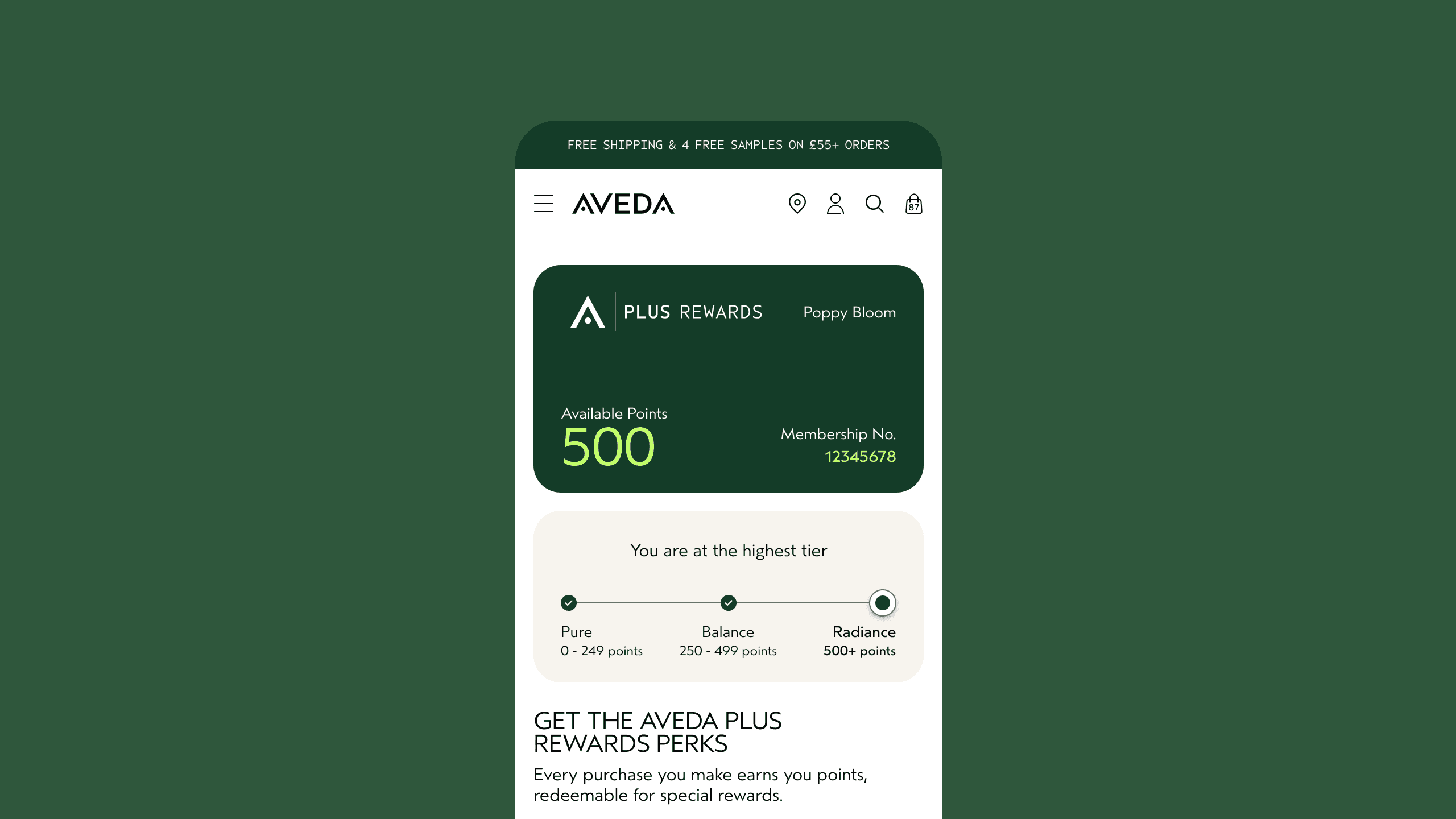 I refreshed the Aveda Plus Rewards experience with a clean, intuitive design that highlights points, and tier status. The interface blends Aveda’s premium aesthetic with a clear visual hierarchy. Built with scalability in mind, the modular system and responsive components were designed to adapt across Estée Lauder Companies brands. Working closely with global UX, brand, and product teams, we created a cohesive, accessible experience aiming to strengthen engagement and set the foundation for future loyalty programs.