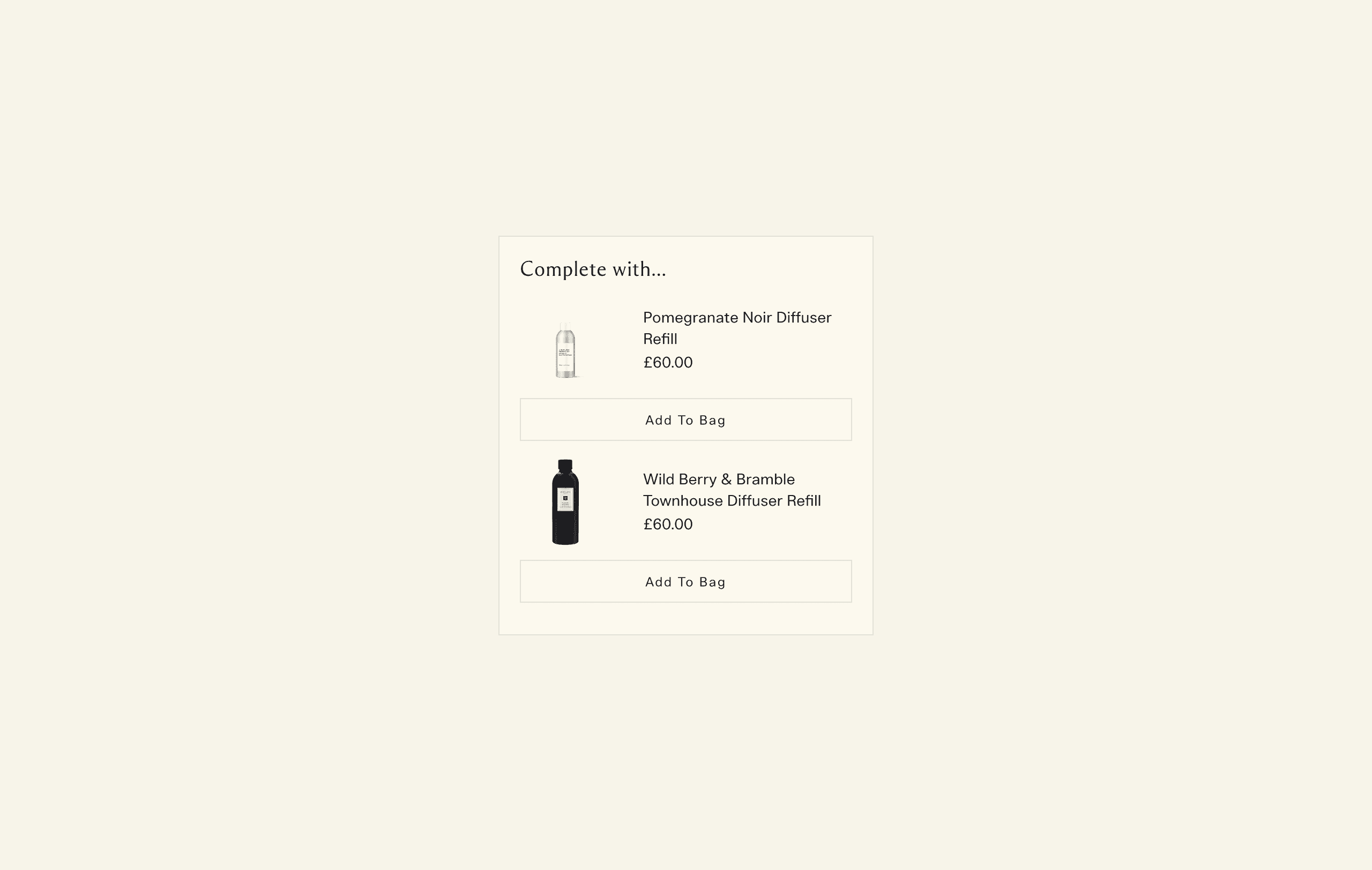 When a user adds a reed diffuser to their bag, the interface reveals a curated selection of refill options they may wish to add. The goal was to make this upsell moment feel natural without disrupting the flow of purchase. I focused on preserving the brand’s refined visual language, using soft contrasts, and balanced spacing, while ensuring the design performed effectively across responsive layouts. The final design increased visibility of refills and created a more seamless and intuitive path to multi item purchases.