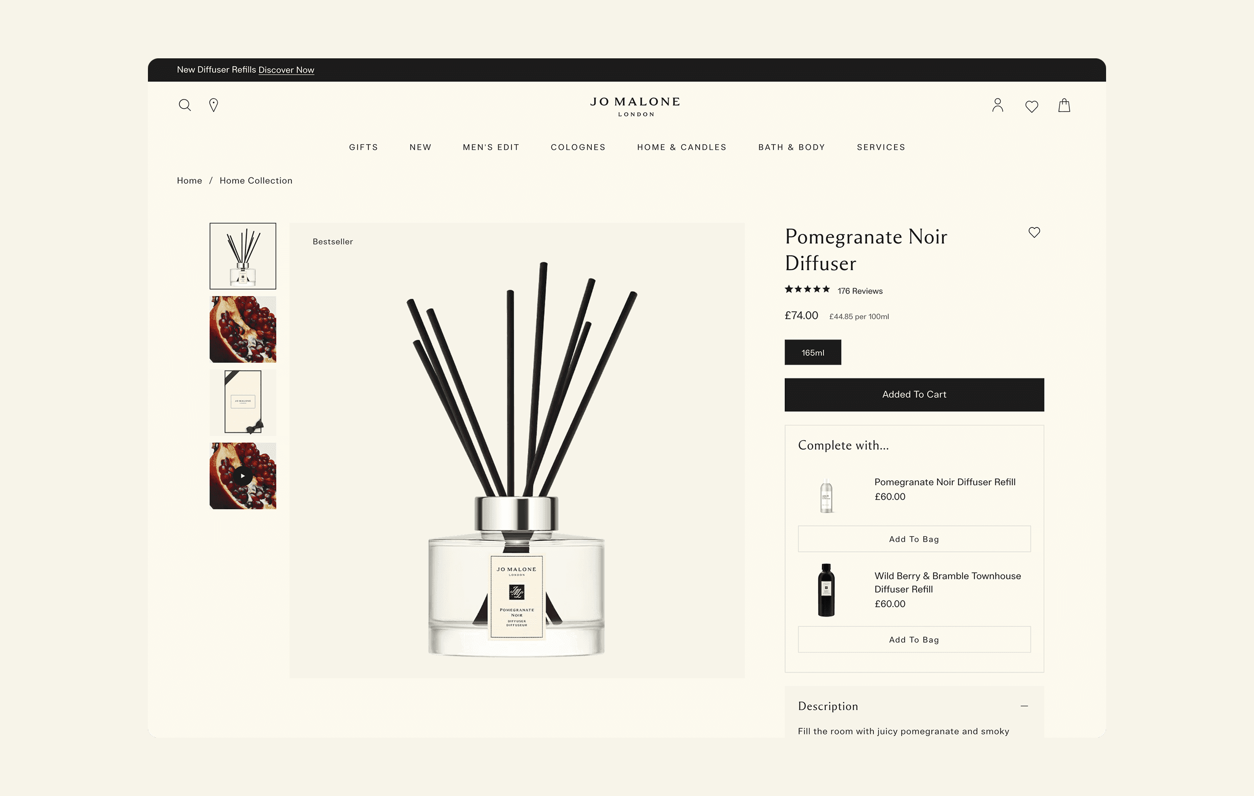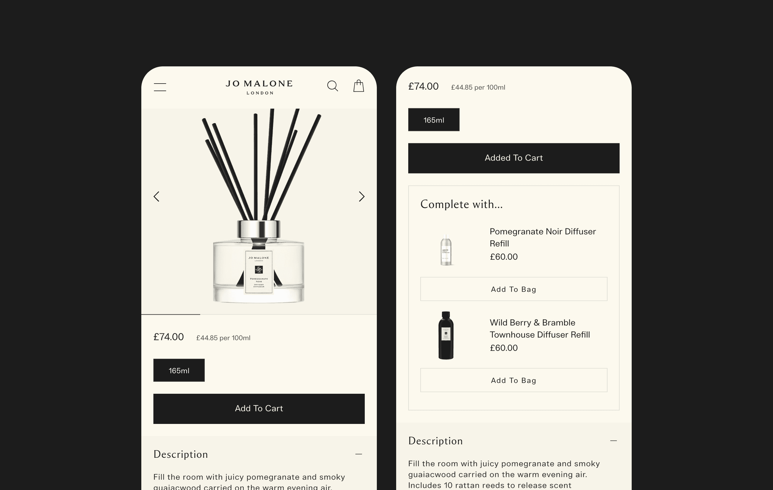 To elevate the Jo Malone London product detail page experience, I designed an inline upsell module that provides a subtle, on brand way to recommend refills and other relevant products. While it was initially created to surface reed diffuser refills, the design was developed with flexibility in mind, allowing it to also showcase complementary items.